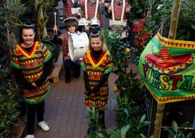 In kerstkleding gezellige kerstnummers ten gehore brengen op b.v. kerstmarkten of in tuincentra.