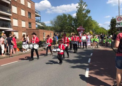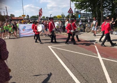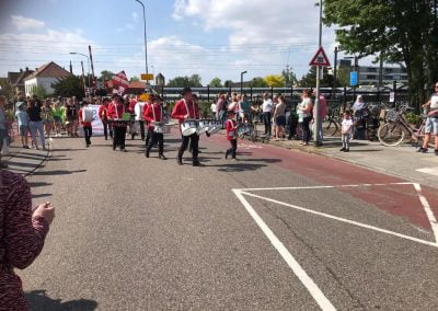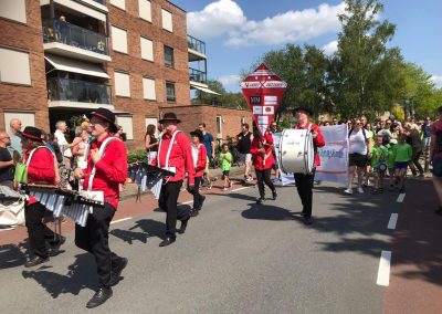Het weer was fantastisch, de sfeer vrolijk en relaxed, want er was eindelijk weer na jaren een Veluwewandeltocht op 14 mei in Nijkerk. De wandelaars hadden er veel zin in en liepen diverse afstanden. De kinderen waren ver weg in de meerderheid, dus allemaal vrolijke gezichten! Om de wandelaars het laatste gedeelte van hun tocht te ondersteunen, liepen er wel 5 muziekkorpsen mee. Door het spelen van prachtige marsen, vrolijke meezingers en ritmische nummers, was het een heel afwisselend muziekfestijn. Slagwerkgroep De Voortzetters was ook van de partij, met zelfs een muzikant van slechts 8 jaar! Hij speelde op de bongo’s en beatring en deed het geweldig. We hebben als groep erg genoten van al het publiek langs de weg, waarbij veel leuke reacties werden gegeven.